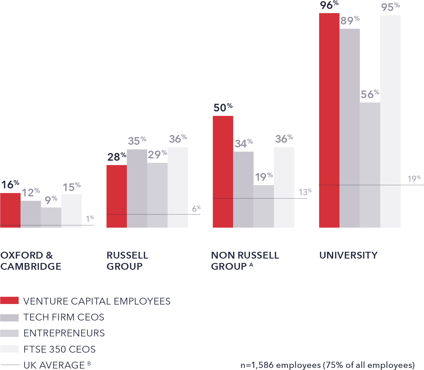 Note B: All fgures for the UK average are based upon the UK’s working age population, apart from the figures for Oxbridge which are calculated for current 18 year olds.
