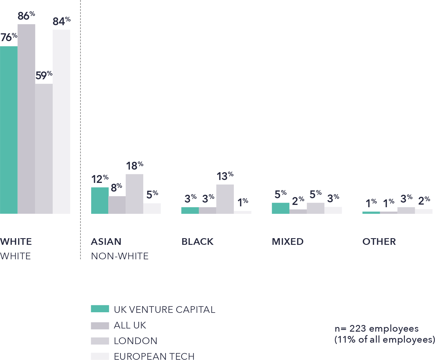 An ethnicity survey of 223 UK venture capitalists suggests that 24% of the venture workforce is non-white. This sample has not been adjusted for selection bias.