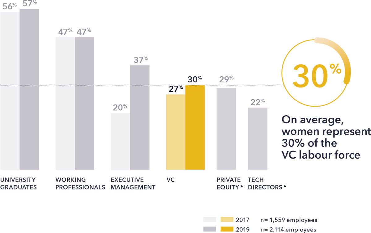 In 2019 women comprise 30% of venture capital personnel – a small increase from 27% in 2017.